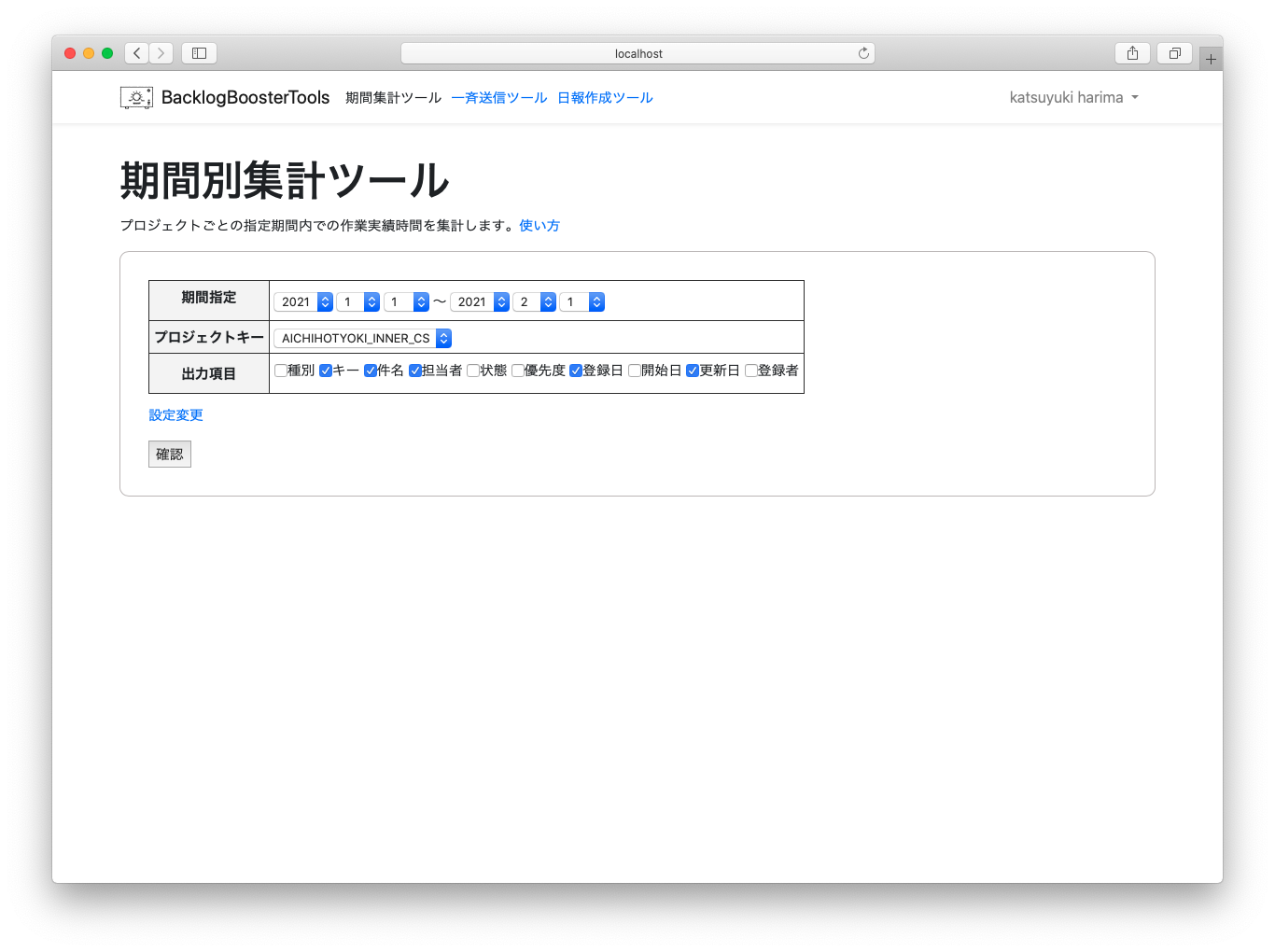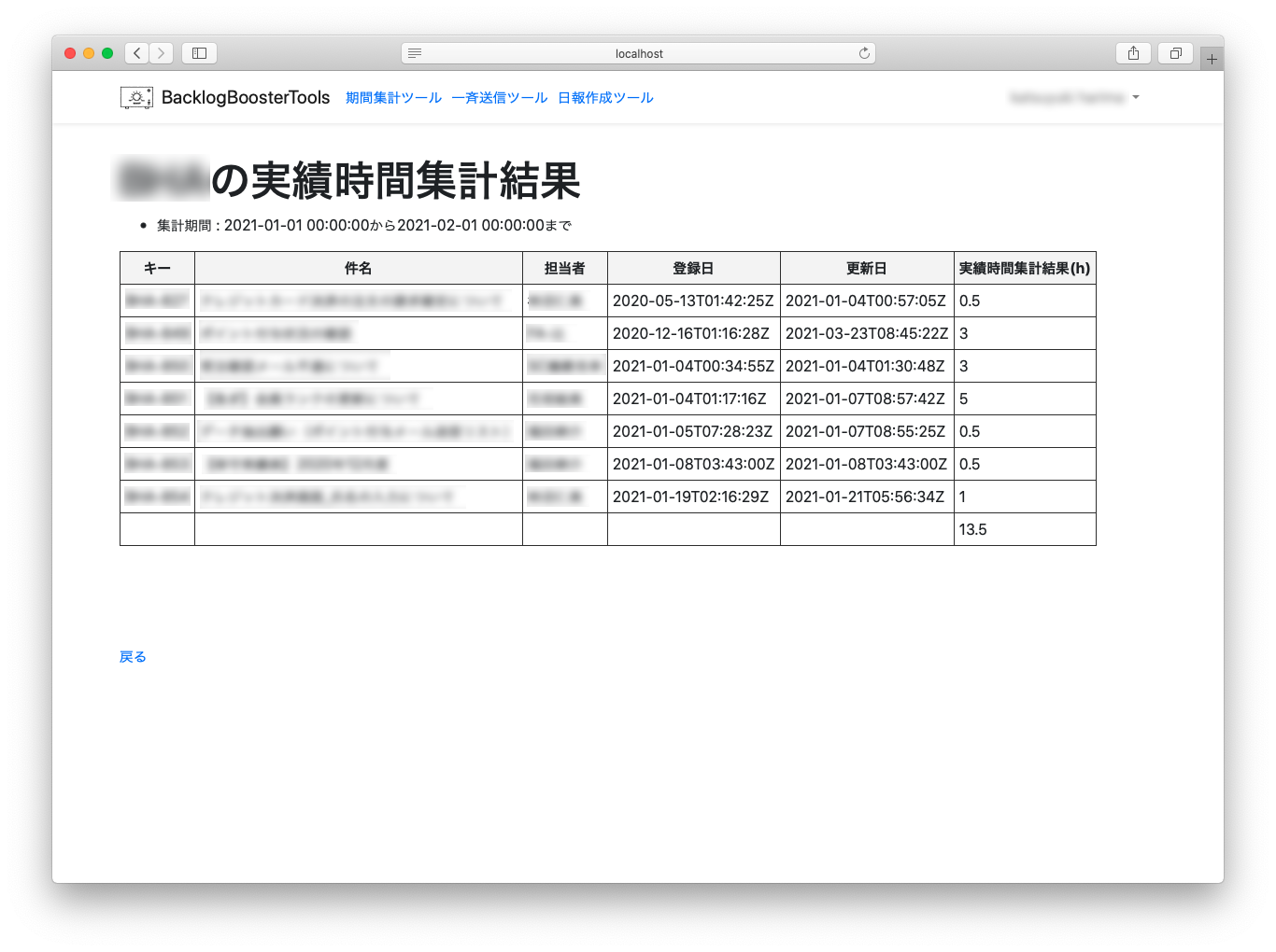 Backlogプロジェクトごとの指定期間内での作業実績時間を集計します。