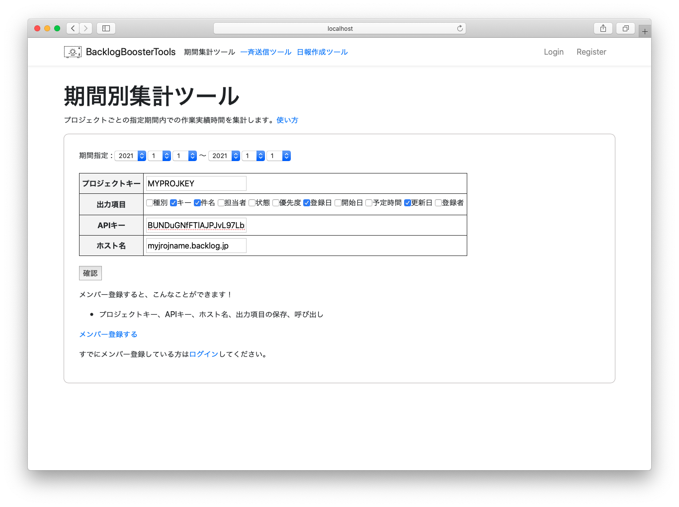 メンバー登録しないでご利用される方は、期間、プロジェクトキー、出力項目、APIキー、ホスト名を入力してください。
